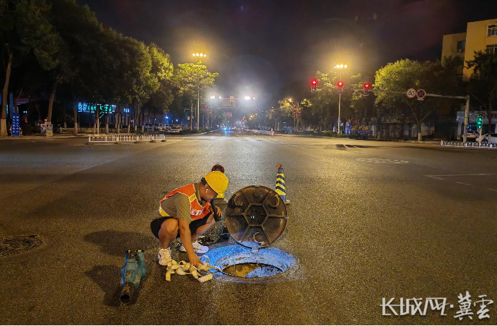 保定供水抢修人员夜间关闭闸门。 通讯员 安柔 摄