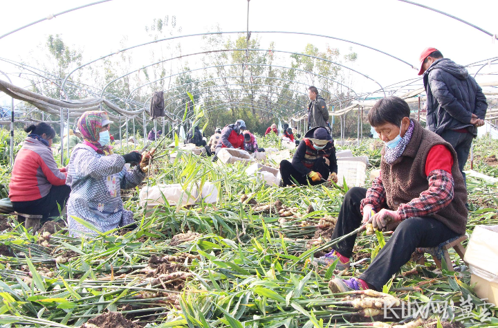 保定高阳县绿泽苗木农民专业合作社生姜种植基地内,工人正在剪姜秆。通讯员 杨瀰 摄